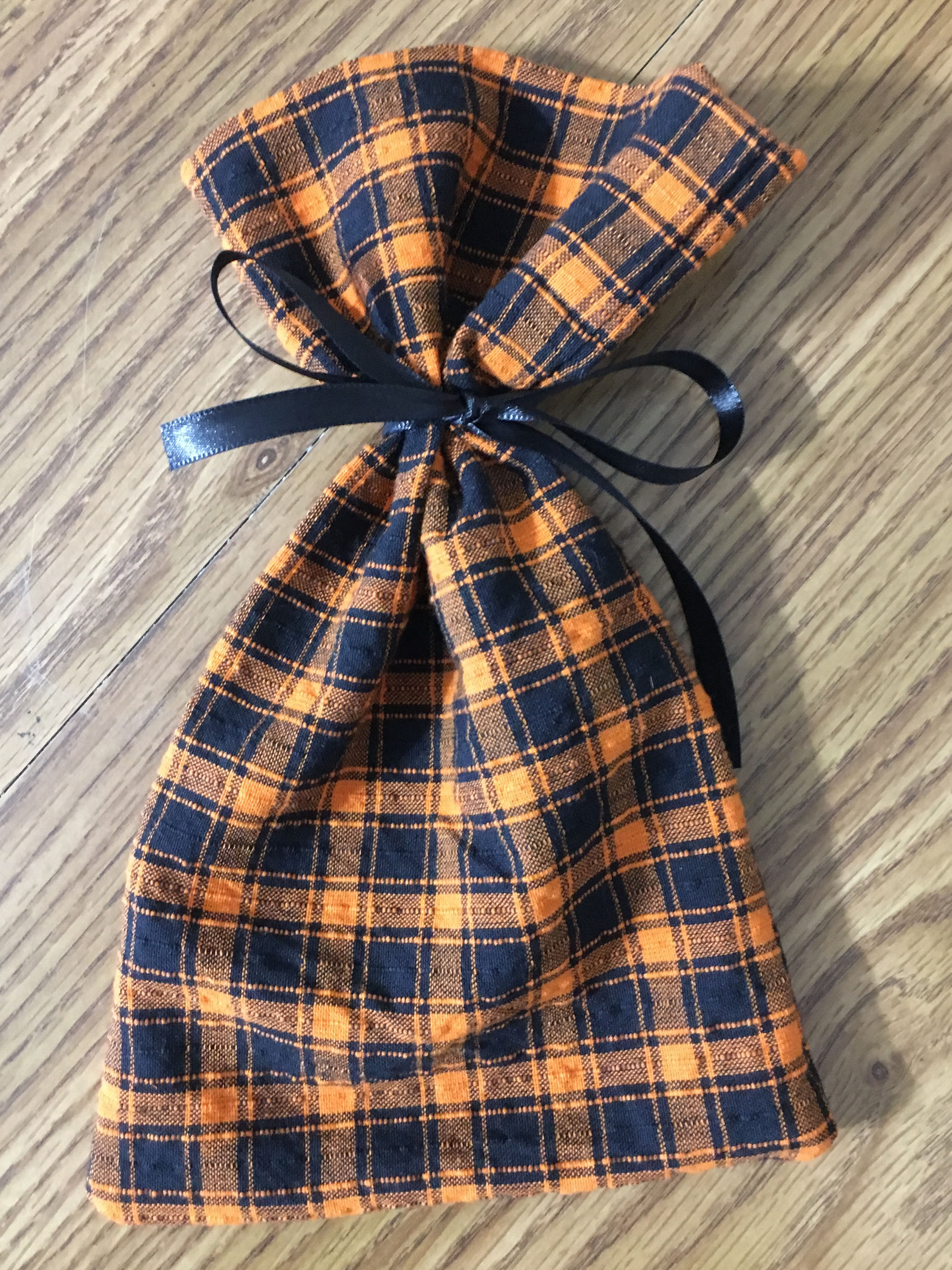 Finally turn your bag right side out. Tie your ribbon around the bag right below the seam. To keep your ribbon edges from fraying, you can put a little clear nail polish on them.