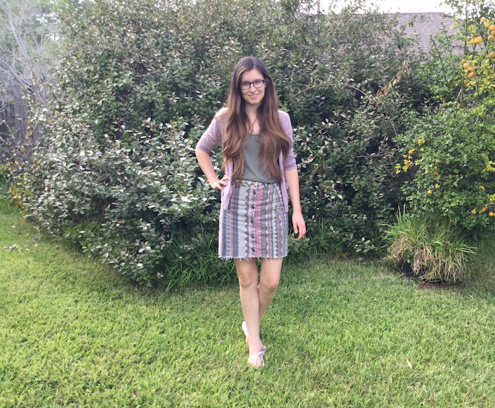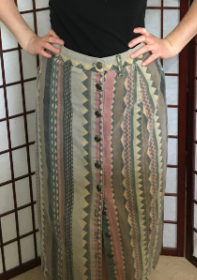 I was so excited when I found this skirt at the thrift store! I loved the pattern and that it was button down. As you can see, the skirt looked a bit different when I originally bought it. It was really long and didn’t fit as well so I cut it short and took in the sides and back a little. It made a big difference! I also chose to keep the raw edge instead of hemming it. I may change my mind about the hem later but I like it for now. The colors are perfect for fall and now that I’ve made these changes, it’s the perfect time to wear it!